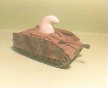 Here a some views of themodel of a very rare vehicle, the SCHTROUMPFGESCHUTZ (AKA theSMURFGESCHUTZ for the US troops). It was designed by theOberschtroumpffuhrer Von Gargamel and built in very smallnumbers. It is based on a STUG IV chassis with a specialcommander protected housing on the roof.