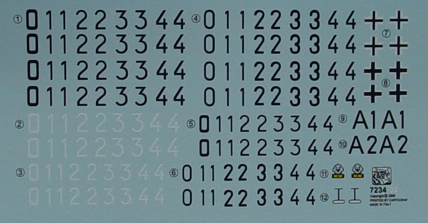 Instructions appear very good, consisting of eight exploded-view line drawings. Color drawings show markings for six different vehicles belonging to two Panzerjager Battalions. In the scan we see that a large sheet of water slide decals is included with a plethora of vehicle numbers.