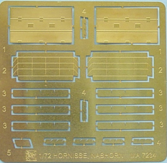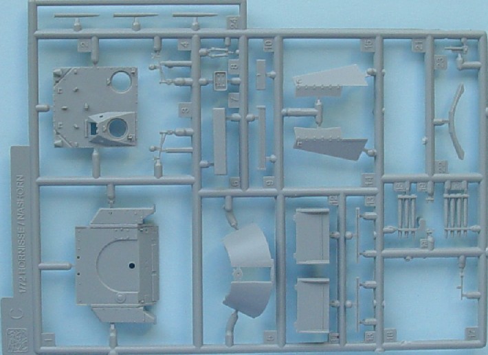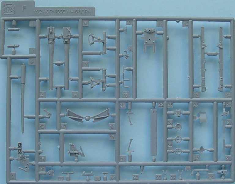 This is an injection molded kit in gray styrene plastic. Also included is a small fret of etched-brass parts and two soft rubber tracks. The vehicle is a heavy German panzerjager based on the Pz IV chassis and carrying the powerful 88-mm L71 Pak 43 antitank gun (a version of the gun on the Tiger 2 tank and the Jagdpanther). The Hornisse is also known as the Nashorn. The Nashorn/Hornisse shares a chassis and superstructure with the SP 150-mm howitzer "Hummel".